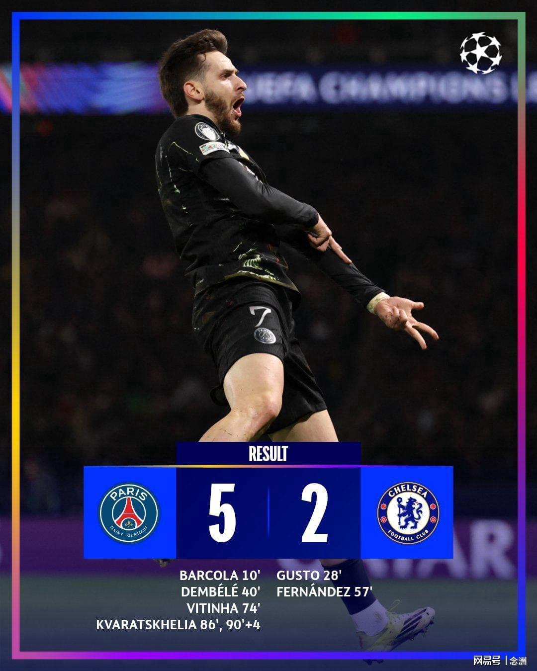 卫冕冠军巴黎圣日耳曼5-2击败切尔西,巴尔科拉首开纪录,登贝莱击中立柱,古斯托扳平比分,登贝莱完成破门,恩佐打进一球,约恩森失误送礼,维蒂尼亚破门,若昂-佩德罗破门但是被判越位在先,克瓦拉茨赫利亚替补双响。